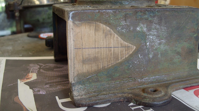 Onde está esta mancha amarelada faltava um pedaço da peça ,que é de ferro fundido ,e por algum acidente teve esta parte quebrada .Como não daria para soldar um pedaço de ferro, resolvi colocar um pedaço de madeira recortada para preencher este espaço ,e completar novamente a peça .
